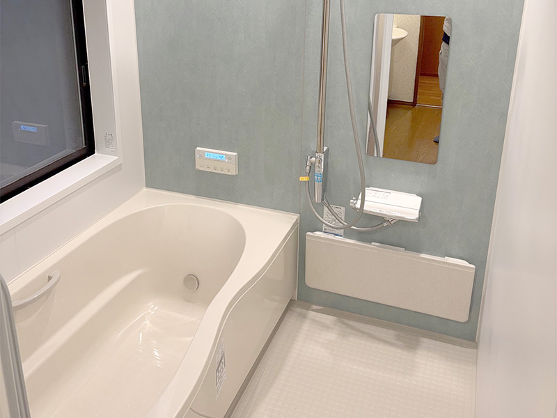 ワイドレバー水栓や、エコアクアシャワーなど快適さをプラスした素敵なお風呂になりました。